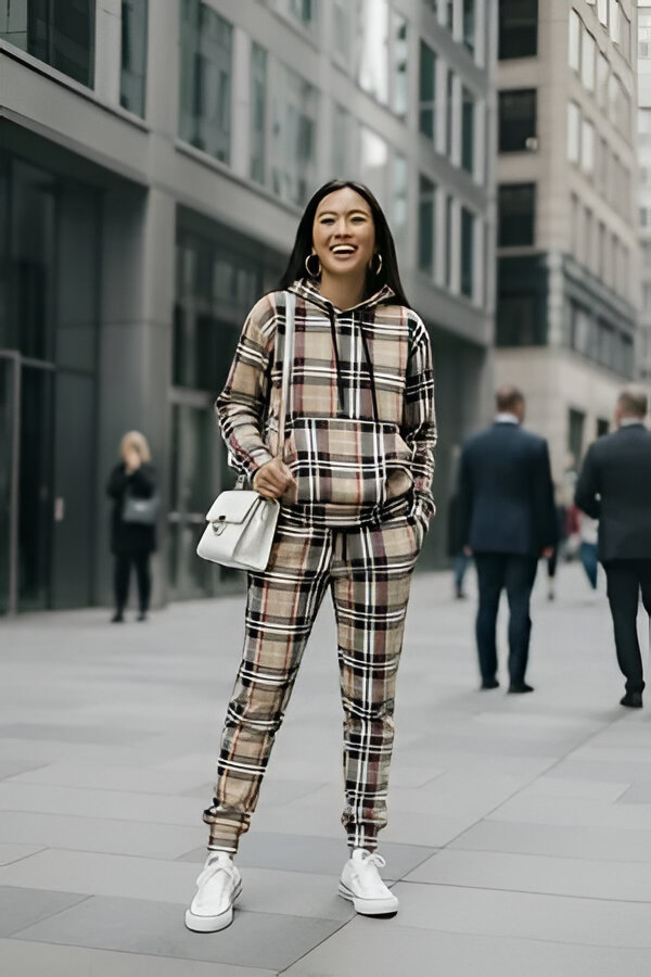 Streetwear meets classic luxury. This two-piece set features a timeless heritage plaid print reimagined for the modern city street. The set includes a relaxed hoodie and matching cuffed joggers. Vibe: Black Graffiti 25 / Casual Luxe.